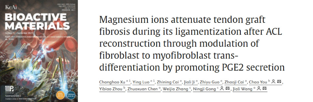 摘要:The ligamentization process of the tendon graft in anterior cruciate ligament(ACL) reconstruction is crucial for graft healing quality, thereby affecting knee joint function. Excessive scar tissue, caused by activation of trans-differentiation of fibroblasts to myofibroblasts, rather than orientated collagen fibers with normal composition and structure in the graft mid-substance seriously impacts ligamentization. The elucidation of the underlying mechanism behind the graft fibrosis may facilitate modulation of tendon graft ligamentization. Here, we show that transforming growth factor beta 1(TGF-β1) was significantly upregulated with ligamentization process, contributing to fibroblast to myofibroblast trans-differentiation and thereby leading to impaired collagen orientation with overproduction of collagen type III. Of note, we verified that prostaglandin E2(PGE2), a principal mediator of inflammation secreted by macrophages, significantly reversed TGF-β1-induced trans-differentiation of fibroblasts to myofibroblasts. Importantly, magnesium(Mg) ions were found to upregulate PGE2 production in macrophages, ultimately favoring inhibition of scar tissue formation and promoting expression of ligament-like phenotype in the graft mid-substance in rats. Consistently, the rats, with injection of the sodium alginate containing Mg ions into knee joint cavity, exhibited significantly improved gait performance and failure load relative to the control group. These results demonstrate the feasibility of using Mg ions to modulate tendon ligamentization in patients after ACL reconstruction.