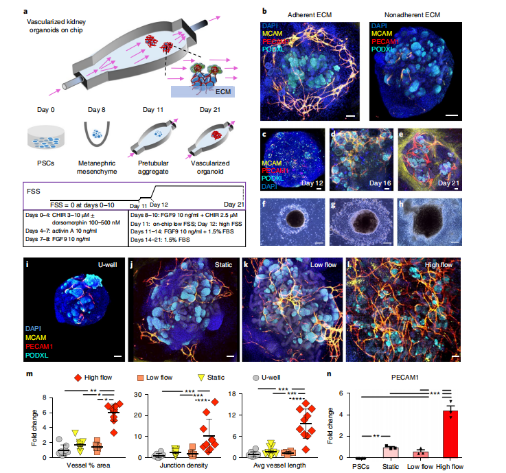 圖1:在高流體流動(dòng)下體外培養(yǎng)的腎器官在腎發(fā)生過(guò)程中表現(xiàn)出增強(qiáng)的血管形成作用。a. 在毫米流控芯片內(nèi)的工程化的ECM上進(jìn)行受控于FSS的腎臟類(lèi)器官的體外培養(yǎng)。分化天數(shù)和培養(yǎng)在面板的中部和底部指示條件。未按比例繪制的器官ID。b.對(duì)在粘附性或非粘附性ECM上培養(yǎng)的類(lèi)器官的DNA、MCAM、Pectam1和Podxl等標(biāo)志物進(jìn)行染色。比例尺,100μm。c~h. 高FSS下培養(yǎng)的整個(gè)器官免疫染色(c~e)和相差顯微結(jié)果(f~h)的對(duì)比圖像(第12-21天)。比例尺:50μm(c~e)或300μm(f~h),灌注方從左至右。i~l,在靜態(tài)U井、靜態(tài)工程化ECM、低FSS和高FSS條件下培養(yǎng)的類(lèi)器官整體血管標(biāo)記的共聚焦3D渲染。比例尺,100μm。m. 血管系統(tǒng)的豐度和特征的統(tǒng)計(jì)結(jié)果,報(bào)告為相對(duì)于U井培養(yǎng)條件下各個(gè)參數(shù)的倍數(shù)變化。 n. 在各種生長(zhǎng)條件下PECAM1表達(dá)的定量PCR分析結(jié)果。