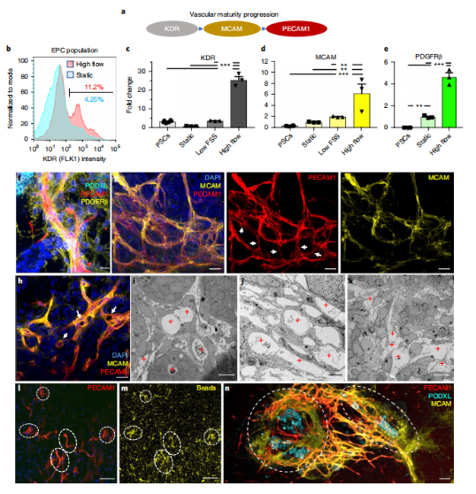 圖2:在體外培養(yǎng)的腎組織中,觀察到細(xì)胞器內(nèi)和細(xì)胞器間血管網(wǎng)有壁細(xì)胞支撐的可灌注腔。a. 腎內(nèi)皮細(xì)胞在體內(nèi)發(fā)育過(guò)程中的成熟圖,從祖細(xì)胞到持續(xù)的終末標(biāo)記表達(dá)。b. 培養(yǎng)第21天分離的整個(gè)類(lèi)器官的流式細(xì)胞分析。EPC為FLK 1陽(yáng)性細(xì)胞群。c.d. 培養(yǎng)第21天內(nèi)皮細(xì)胞標(biāo)記物的定量PCR分析結(jié)果。e. 在第21天發(fā)育器官中PDGFRβ的定量PCR分析結(jié)果。 f. PODXL、PECAM 1和PDGFRβ在高FSS下的免疫染色。比例尺,15μM. g. 內(nèi)血管標(biāo)記的類(lèi)器官整體共聚焦三維染色。比例尺,30μM。白色箭頭突出顯示的區(qū)域是PECAM1+MCAM-。h. 圖g中的一個(gè)z軸圖像切片,其中白色箭頭突出顯示打開(kāi)的管腔。比例尺,30μM. I~k,透射電鏡圖像顯示在高FSS(I,j) 和E14.5小鼠胚胎腎臟(k)下,由一層薄膜包裹的圓形開(kāi)口,反映腎臟器官的血管腔。紅色加號(hào)顯示血管腔。比例尺,10μm (i,k) 或2μm(J)。l,m,在高FSS下培養(yǎng)的腎臟細(xì)胞器底部的z軸圖像切片,顯示血管網(wǎng)(l)和熒光微珠在血管網(wǎng)(m)內(nèi)的積聚。比例尺,100μM。n. 共聚焦3D染色顯示橋接的兩個(gè)相鄰的類(lèi)器官(由虛線(xiàn)白線(xiàn)勾勒)。
