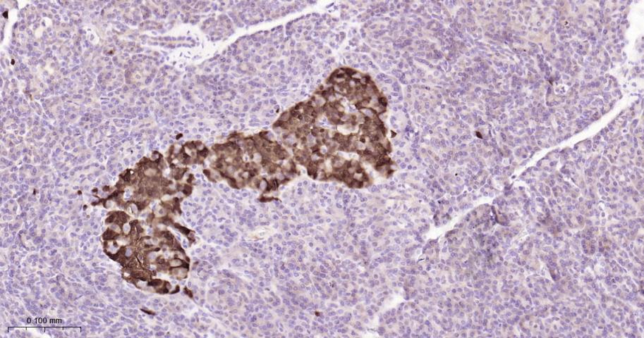Paraformaldehyde-fixed, paraffin embedded Mouse Pancreas; Antigen retrieval by boiling in sodium citrate buffer (pH6.0) for 15 min; The section was incubated with PPP1R1A Monoclonal Antibody, Unconjugated (bsm-61307R) at 1:200 overnight at 4°C, followed by conjugation to the bs-0295G-HRP and DAB (C-0010) staining.