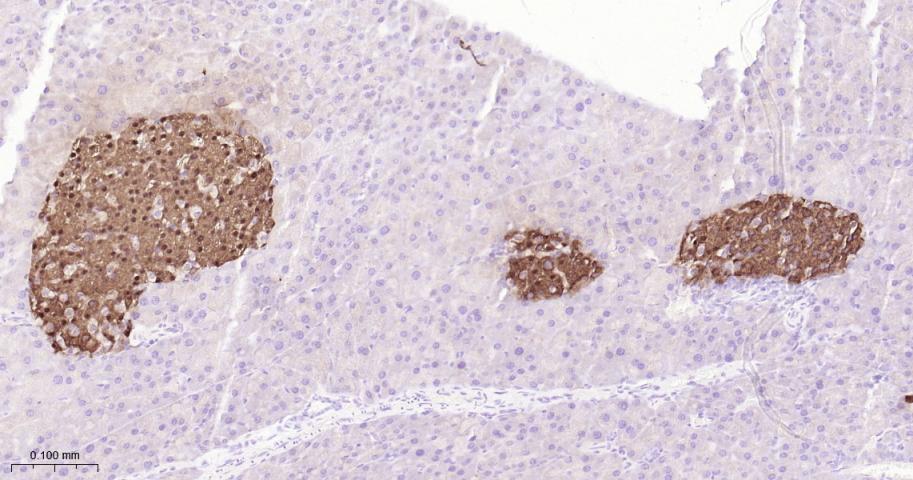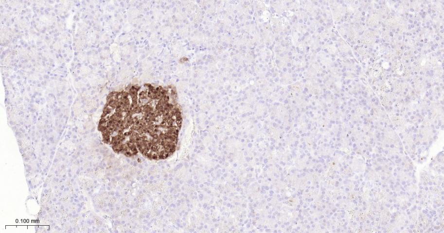 Paraformaldehyde-fixed, paraffin embedded Rat Pancreas; Antigen retrieval by boiling in sodium citrate buffer (pH6.0) for 15 min; The section was incubated with PPP1R1A Monoclonal Antibody, Unconjugated (bsm-61307R) at 1:200 overnight at 4°C, followed by conjugation to the bs-0295G-HRP and DAB (C-0010) staining.