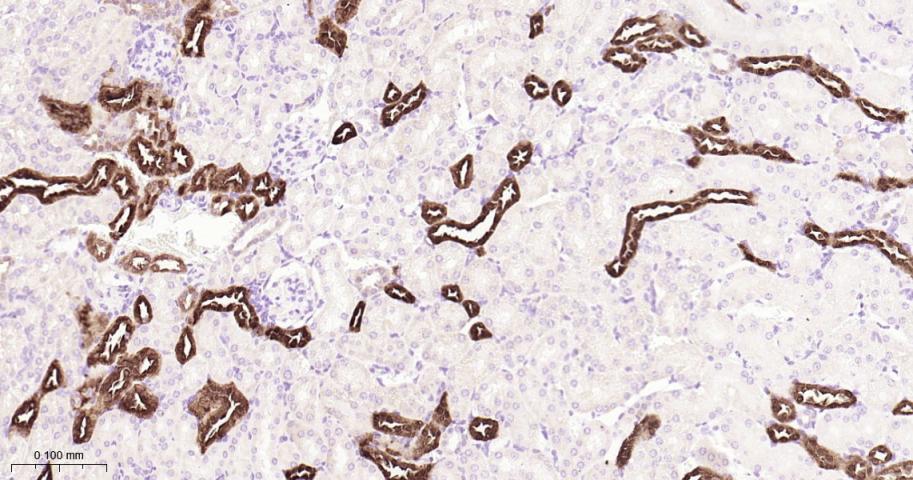 Paraformaldehyde-fixed, paraffin embedded Rat Kidney; Antigen retrieval by boiling in sodium citrate buffer (pH6.0) for 15 min; The section was incubated with PPP1R1A Monoclonal Antibody, Unconjugated (bsm-61307R) at 1:200 overnight at 4°C, followed by conjugation to the bs-0295G-HRP and DAB (C-0010) staining.