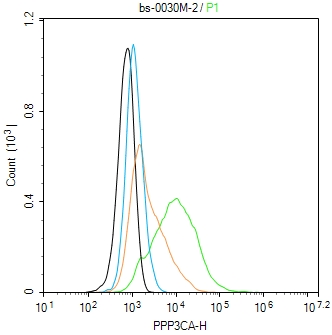 The MCF-7(H) cells were incubated in 5%BSA to block non-specific protein-protein interactions (30 min at r.t.). Primary Antibody (green): Mouse Anti-PPP3CA antibody (bs-0030M): 2μg/10^6 cells; Secondary Antibody (white blue): Goat anti-Mouse IgG-FITC (bs-60296G-FITC): 1 μg/test. Isotype Control (orange): Mouse IgG (bs-0296P). Blank control (black): PBS. Acquisition of 20,000 events was performed.