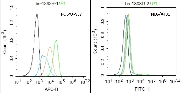 U937(Positive)and A431 Negative control)cells (black) were incubated in 5% BSA blocking buffer for 30 min at room temperature. Cells were then stained with CD13 Antibody(bs-1383R)at 1:100 dilution in blocking buffer and incubated for 30 min at room temperature, washed twice with 2% BSA in PBS, followed by secondary antibody(blue) incubation for 40 min at room temperature. Acquisitions of 20,000 events were performed. Cells stained with primary antibody (green), and isotype control (orange).