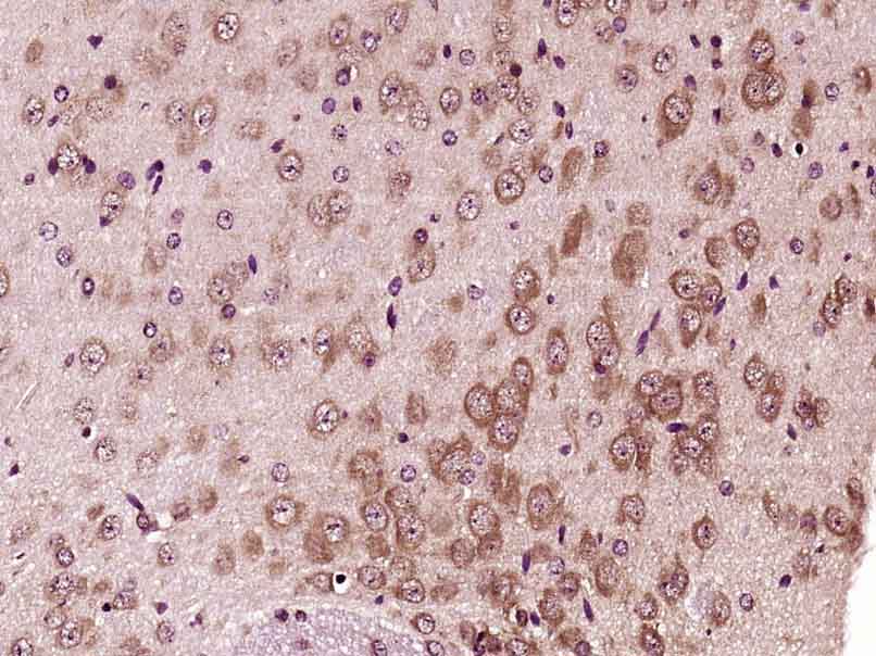 Paraformaldehyde-fixed, paraffin embedded (Mouse brain); Antigen retrieval by boiling in sodium citrate buffer (pH6.0) for 15min; Block endogenous peroxidase by 3% hydrogen peroxide for 20 minutes; Blocking buffer (normal goat serum) at 37°C for 30min; Antibody incubation with (PFKFB3/PFK2) Polyclonal Antibody, Unconjugated (bs-3528R) at 1:400 overnight at 4°C, followed by operating according to SP Kit(Rabbit) (sp-0023) instructionsand DAB staining.