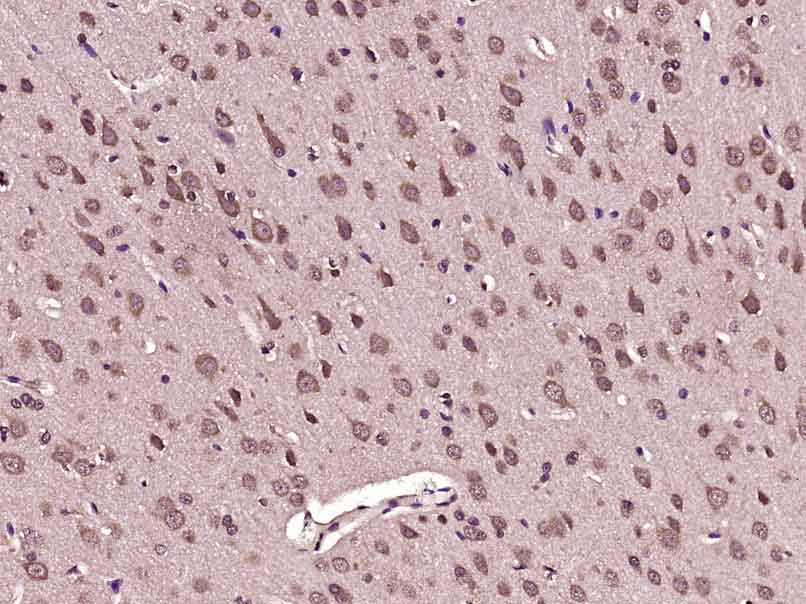 Paraformaldehyde-fixed, paraffin embedded (Rat brain); Antigen retrieval by boiling in sodium citrate buffer (pH6.0) for 15min; Block endogenous peroxidase by 3% hydrogen peroxide for 20 minutes; Blocking buffer (normal goat serum) at 37°C for 30min; Antibody incubation with (PFKFB3/PFK2) Polyclonal Antibody, Unconjugated (bs-3528R) at 1:400 overnight at 4°C, followed by operating according to SP Kit(Rabbit) (sp-0023) instructionsand DAB staining.