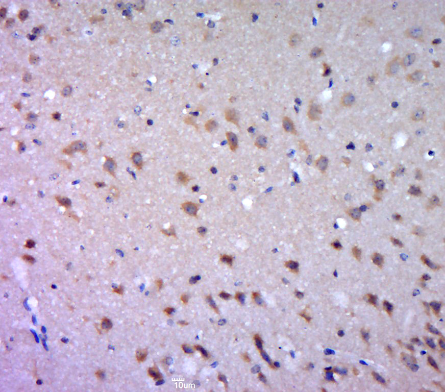 Paraformaldehyde-fixed, paraffin embedded (mouse brain tissue); Antigen retrieval by boiling in sodium citrate buffer (pH6.0) for 15min; Block endogenous peroxidase by 3% hydrogen peroxide for 20 minutes; Blocking buffer (normal goat serum) at 37°C for 30min; Antibody incubation with (DGAT1) Polyclonal Antibody, Unconjugated (bs-2332R) at 1:400 overnight at 4°C, followed by a conjugated secondary (sp-0023) for 20 minutes and DAB staining.