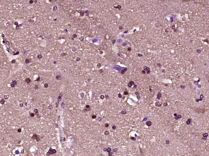Paraformaldehyde-fixed, paraffin embedded (Human brain glioma); Antigen retrieval by boiling in sodium citrate buffer (pH6.0) for 15min; Block endogenous peroxidase by 3% hydrogen peroxide for 20 minutes; Blocking buffer (normal goat serum) at 37°C for 30min; Antibody incubation with (phospho-HDAC1 (Ser423+Ser421)) Polyclonal Antibody, Unconjugated (bs-5388R) at 1:400 overnight at 4°C, followed by operating according to SP Kit(Rabbit) (sp-0023) instructionsand DAB staining.