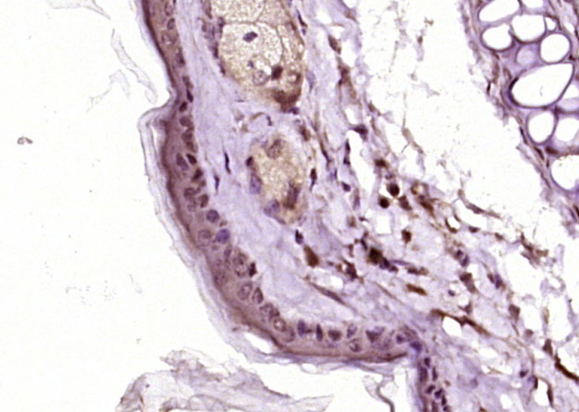 Paraformaldehyde-fixed, paraffin embedded (mouse skin tissue); Antigen retrieval by boiling in sodium citrate buffer (pH6.0) for 15min; Block endogenous peroxidase by 3% hydrogen peroxide for 20 minutes; Blocking buffer (normal goat serum) at 37°C for 30min; Antibody incubation with (NUAK2) Polyclonal Antibody, Unconjugated (bs-5811R) at 1:200 overnight at 4°C, followed by operating according to SP Kit(Rabbit) (sp-0023) instructionsand DAB staining.