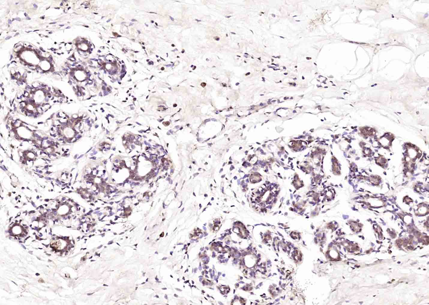 Paraformaldehyde-fixed, paraffin embedded (human breast); Antigen retrieval by boiling in sodium citrate buffer (pH6.0) for 15min; Block endogenous peroxidase by 3% hydrogen peroxide for 20 minutes; Blocking buffer (normal goat serum) at 37°C for 30min; A