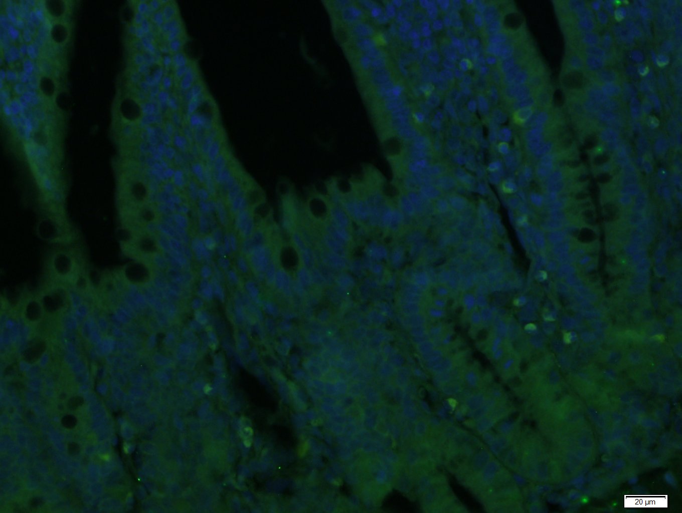 Paraformaldehyde-fixed, paraffin embedded (Rat colon); Antigen retrieval by boiling in sodium citrate buffer (pH6.0) for 15min; Block endogenous peroxidase by 3% hydrogen peroxide for 20 minutes; Blocking buffer (normal goat serum) at 37°C for 30min; Antibody incubation with (ZAK) Polyclonal Antibody, Unconjugated (bs-13546R) at 1:400 overnight at 4°C, followed by a conjugated Goat Anti-Rabbit IgG antibody (bs-0295G-AF488) for 90 minutes, and DAPI for nuclei staining.