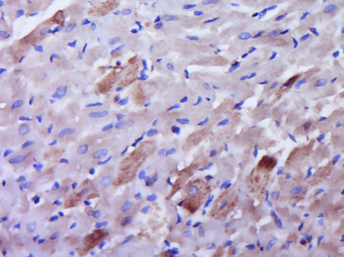 Paraformaldehyde-fixed, paraffin embedded (Rat heart); Antigen retrieval by boiling in sodium citrate buffer (pH6.0) for 15min; Block endogenous peroxidase by 3% hydrogen peroxide for 20 minutes; Blocking buffer (normal goat serum) at 37°C for 30min; Antibody incubation with (CYP2U1) Polyclonal Antibody, Unconjugated (bs-14153R) at 1:400 overnight at 4°C, followed by operating according to SP Kit(Rabbit) (sp-0023) instructions and DAB staining.