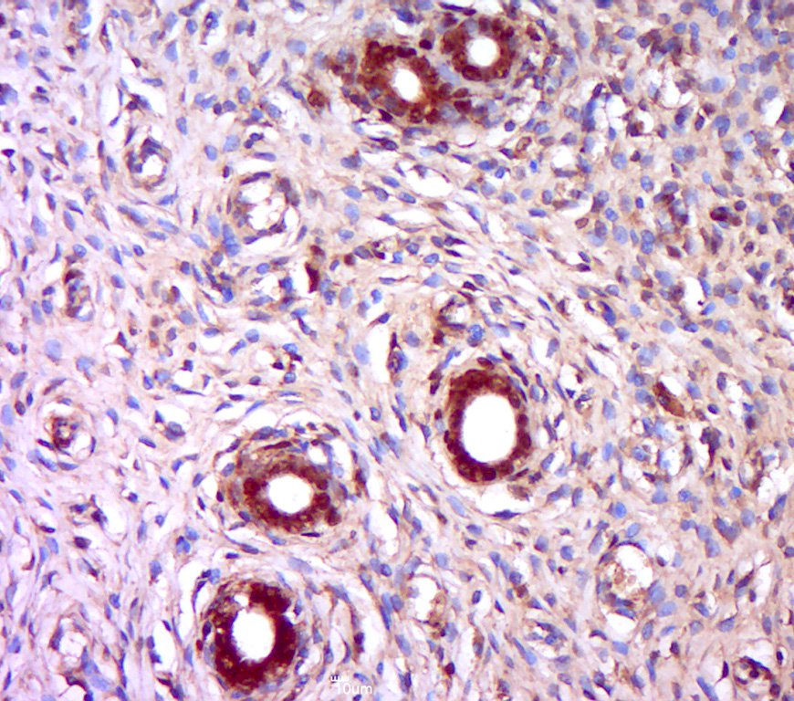 Paraformaldehyde-fixed, paraffin embedded (rat uterus tissue); Antigen retrieval by boiling in sodium citrate buffer (pH6.0) for 15min; Block endogenous peroxidase by 3% hydrogen peroxide for 20 minutes; Blocking buffer (normal goat serum) at 37°C for 30min; Antibody incubation with (TPRKB) Polyclonal Antibody, Unconjugated (bs-17175R) at 1:400 overnight at 4°C, followed by a conjugated secondary (sp-0023) for 20 minutes and DAB staining.