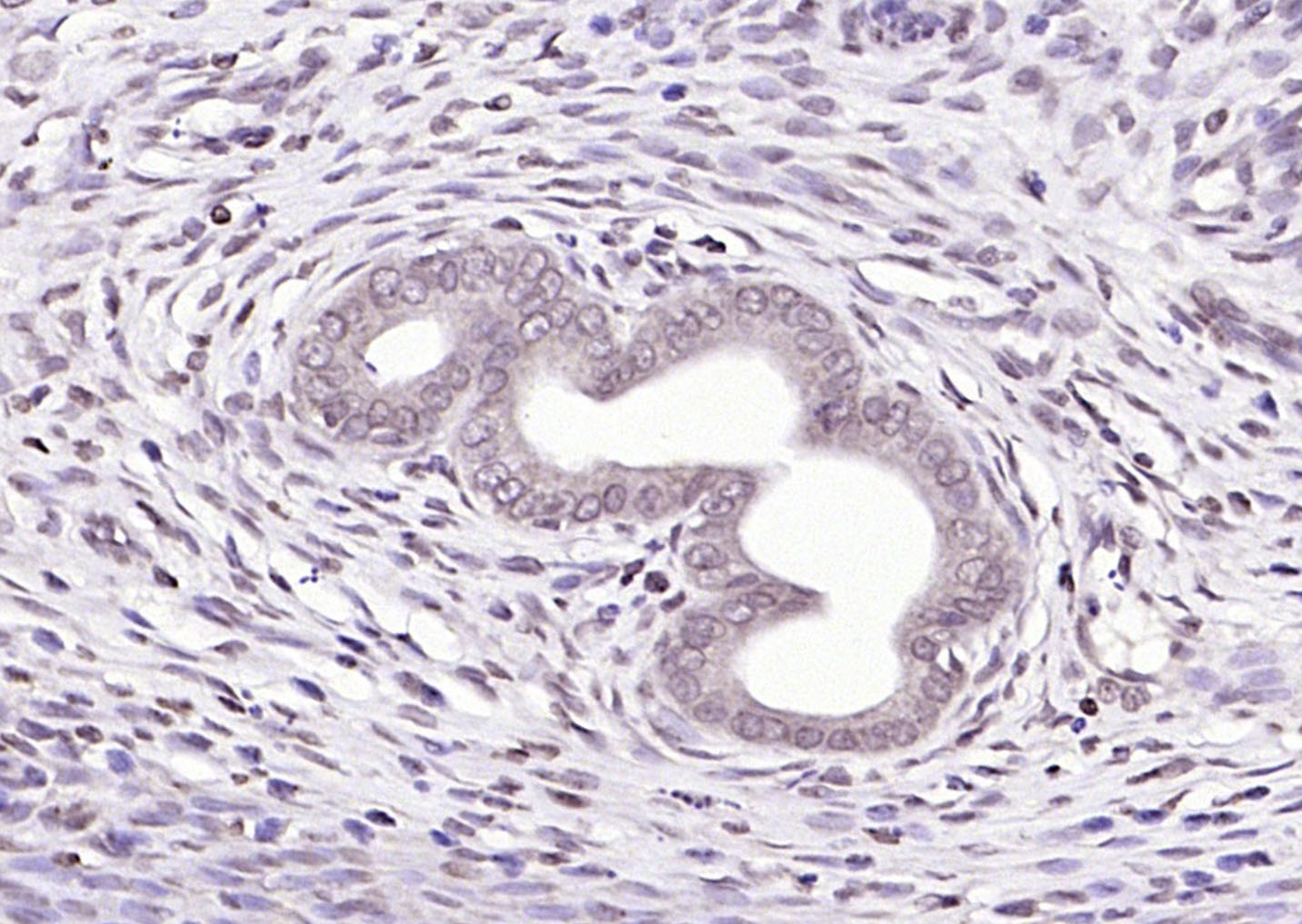 Paraformaldehyde-fixed, paraffin embedded (mouse uterus); Antigen retrieval by boiling in sodium citrate buffer (pH6.0) for 15min; Block endogenous peroxidase by 3% hydrogen peroxide for 20 minutes; Blocking buffer (normal goat serum) at 37°C for 30min; Antibody incubation with (SBNO1) Polyclonal Antibody, Unconjugated (bs-17251R) at 1:200 overnight at 4°C, followed by operating according to SP Kit(Rabbit) (sp-0023) instructionsand DAB staining.