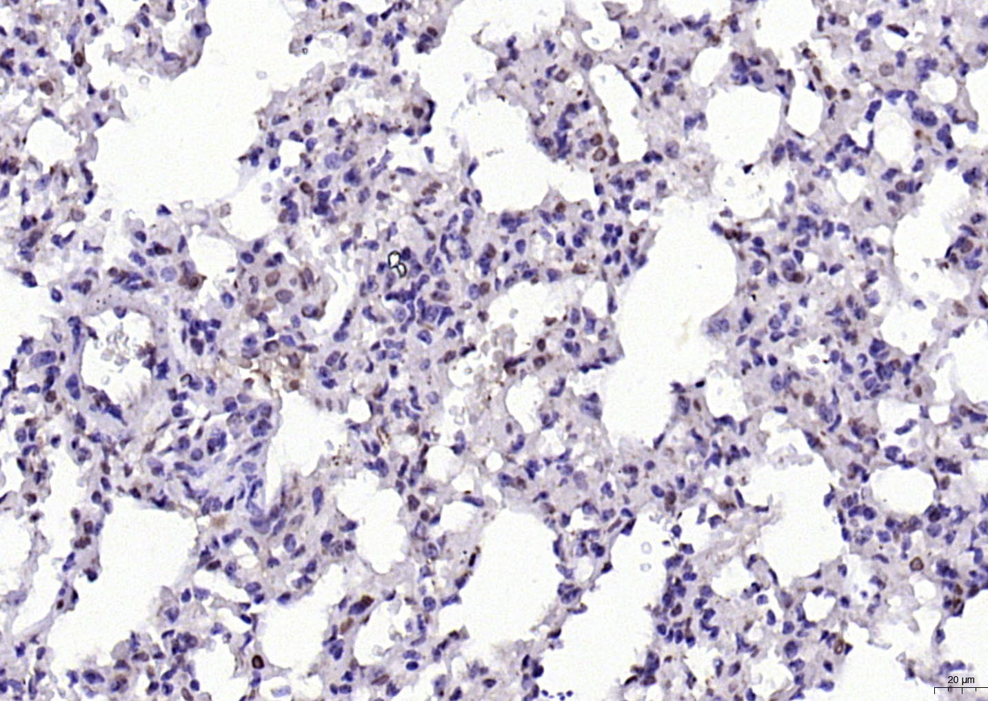 Paraformaldehyde-fixed, paraffin embedded (mouse lung); Antigen retrieval by boiling in sodium citrate buffer (pH6.0) for 15min; Block endogenous peroxidase by 3% hydrogen peroxide for 20 minutes; Blocking buffer (normal goat serum) at 37°C for 30min; Antibody incubation with (SBNO1) Polyclonal Antibody, Unconjugated (bs-17251R) at 1:200 overnight at 4°C, followed by operating according to SP Kit(Rabbit) (sp-0023) instructionsand DAB staining.