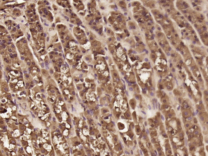 Paraformaldehyde-fixed, paraffin embedded (rat stomach tissue); Antigen retrieval by boiling in sodium citrate buffer (pH6.0) for 15min; Block endogenous peroxidase by 3% hydrogen peroxide for 20 minutes; Blocking buffer (normal goat serum) at 37°C for 30min; Antibody incubation with (PPP1R11) Polyclonal Antibody, Unconjugated (bs-19989R) at 1:400 overnight at 4°C, followed by operating according to SP Kit(Rabbit) (sp-0023) instructionsand DAB staining.