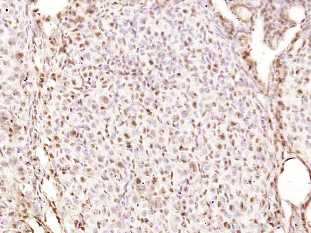Paraformaldehyde-fixed, paraffin embedded (mouse ovary); Antigen retrieval by boiling in sodium citrate buffer (pH6.0) for 15min; Block endogenous peroxidase by 3% hydrogen peroxide for 20 minutes; Blocking buffer (normal goat serum) at 37°C for 30min; Antibody incubation with (Smad3) Polyclonal Antibody, Unconjugated (bsm-52224R) at 1:200 overnight at 4°C, followed by operating according to SP Kit(Rabbit) (sp-0023) instructionsand DAB staining.