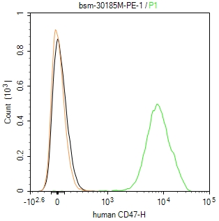 The Jurkat (H) cells were incubated in 5%BSA to block non-specific protein-protein interactions (30 min at r.t.). Primary Antibody (green): PE conjugated Mouse Anti-human CD47 antibody (bsm-30185M)10 μL/Test; Isotype Control (orange): Mouse IgG/PE (bs-0296P). Blank control (black): PBS. Acquisition of 20,000 events was performed.