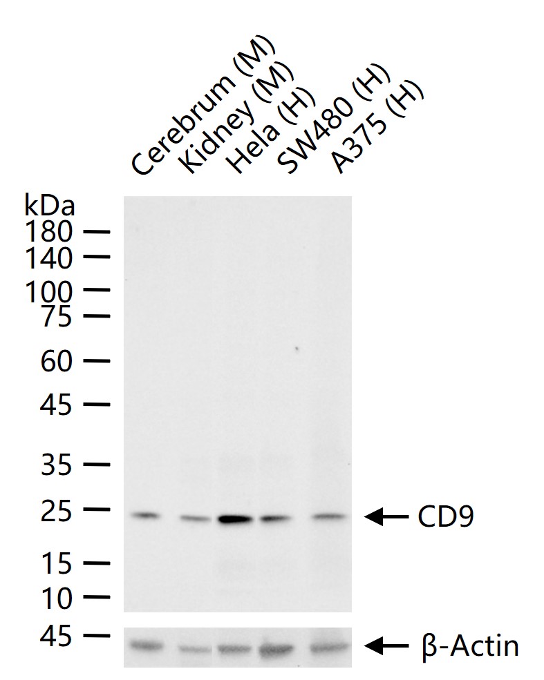 25 ug total protein per lane of various lysates (see on figure) probed with CD9 monoclonal antibody, unconjugated (bsm-52264R) at 1:2000 dilution and 4°C overnight incubation. Followed by conjugated secondary antibody incubation at r.t. for 60 min.