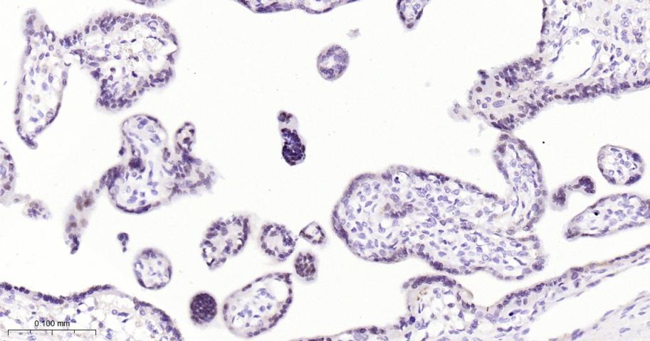 Paraformaldehyde-fixed, paraffin embedded Human Placenta; Antigen retrieval by boiling in sodium citrate buffer (pH6.0) for 15 min; The section was incubated with ATF3 Monoclonal Antibody, Unconjugated (bsm-60931R) at 1:200 overnight at 4°C, followed by conjugation to the bs-0295G-HRP and DAB (C-0010) staining.