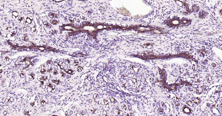 Immunohistochemical analysis of paraffin embedded human breast cancer tissue slide using IHC0249H (Human CK18 IHC Kit).
