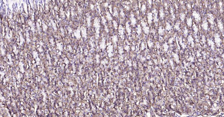 Immunohistochemical analysis of paraffin embedded rat stomach tissue slide using IHC0259R (Rat Sodium Potassium ATPase IHC Kit).