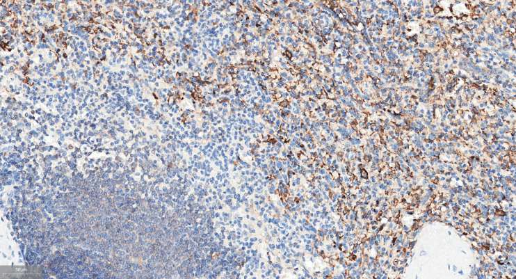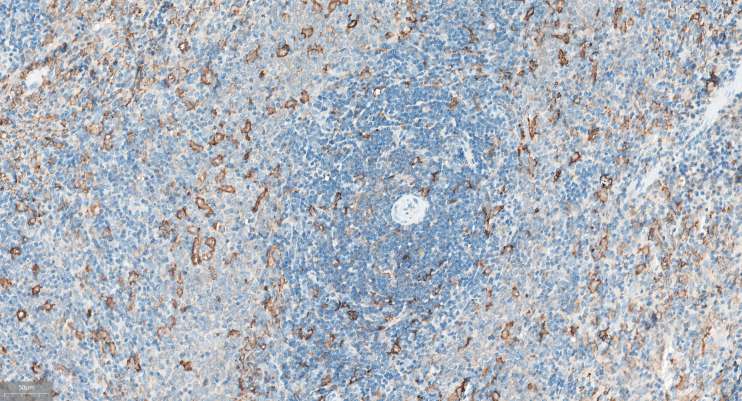 Immunohistochemical analysis of paraffin embedded human spleen tissue slide using IHC0271 (FGF21 IHC Kit).