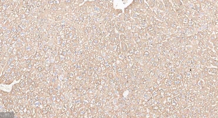 Immunohistochemical analysis of paraffin embedded human liver tissue slide using IHC0271 (FGF21 IHC Kit).