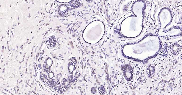 Immunohistochemical analysis of paraffin embedded human breast cancer tissue slide using IHC0274 (AKT1 IHC Kit).