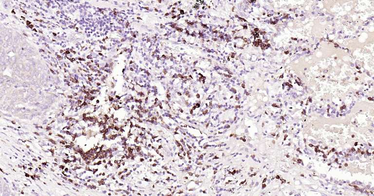 Immunohistochemical analysis of paraffin embedded human lung cancer tissue slide using IHC0284H (Human CD79A IHC Kit).