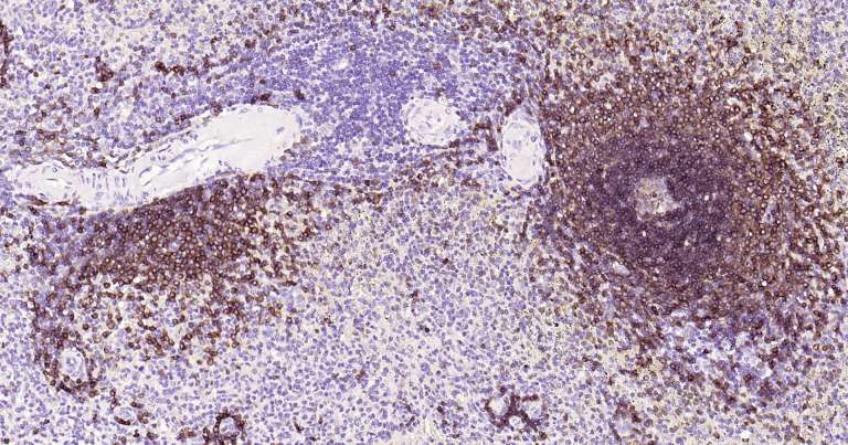 Immunohistochemical analysis of paraffin embedded human spleen tissue slide using IHC0284H (Human CD79A IHC Kit).