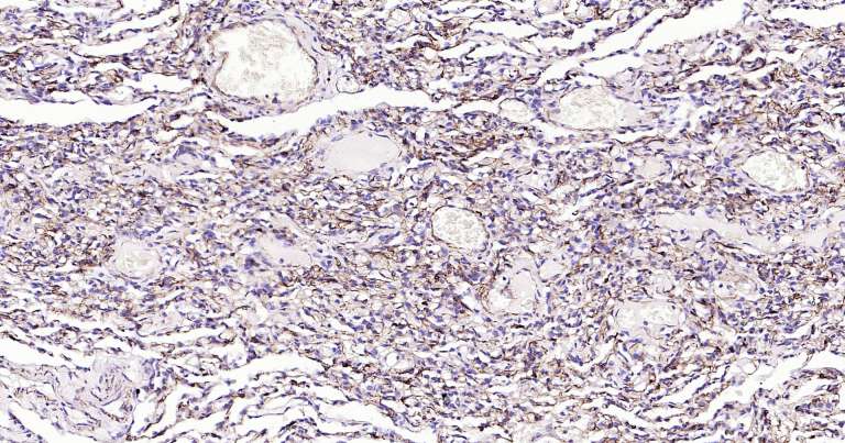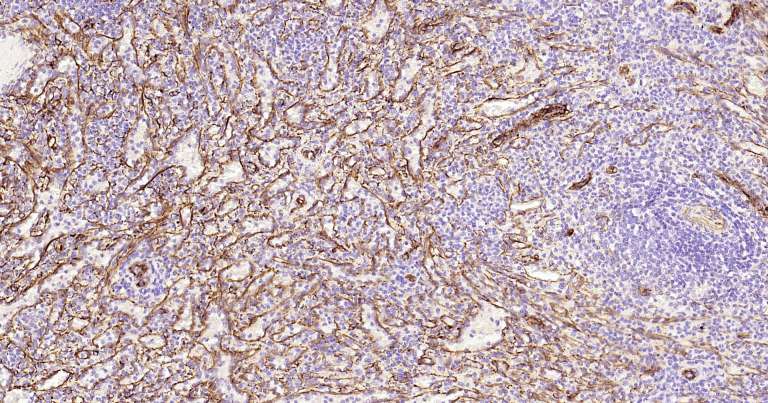 Immunohistochemical analysis of paraffin embedded human spleen tissue slide using IHC0209H (Human Nestin IHC Kit).
