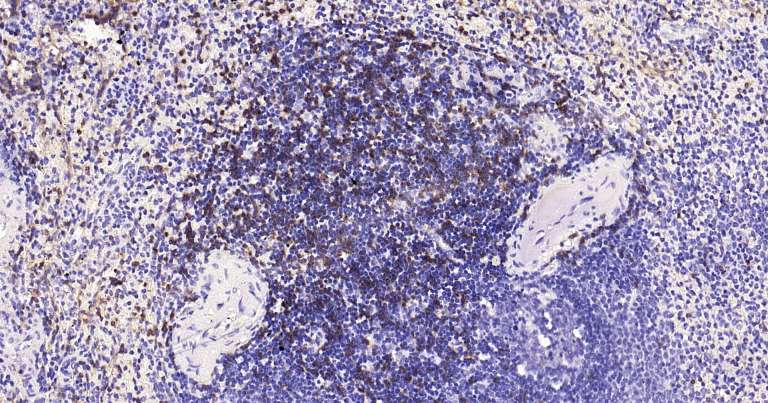 Immunohistochemical analysis of paraffin embedded human spleen tissue slide using IHC0190H (Human CD8 IHC Kit).