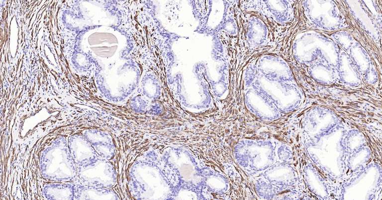 Immunohistochemical analysis of paraffin embedded human prostate tissue slide using IHC0290H (Human CNN1 IHC Kit).