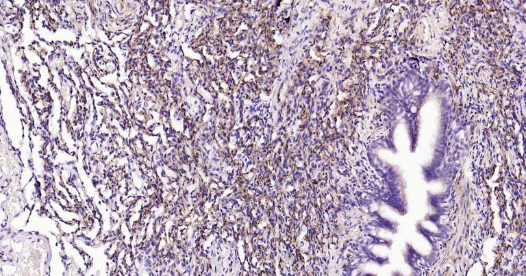 Immunohistochemical analysis of paraffin embedded human placenta tissue slide using IHC0293H (Human CD34 IHC Kit).