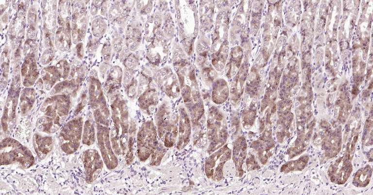 Immunohistochemical analysis of paraffin embedded human stomach tissue slide using IHC0294H (Human SQSTM1/p62 IHC Kit).
