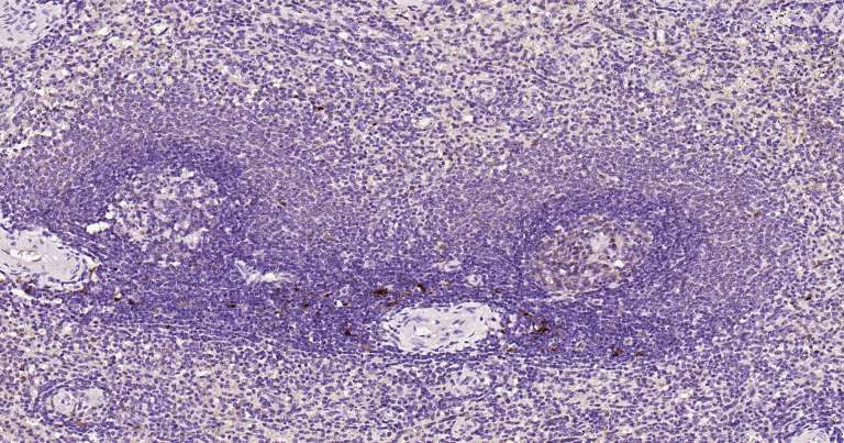 Immunohistochemical analysis of paraffin embedded human spleen tissue slide using IHC0294H (Human SQSTM1/p62 IHC Kit).