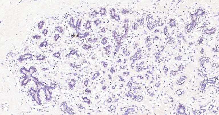 Immunohistochemical analysis of paraffin embedded human mammary gland tissue slide using IHC0296 (SOX10 IHC Kit).