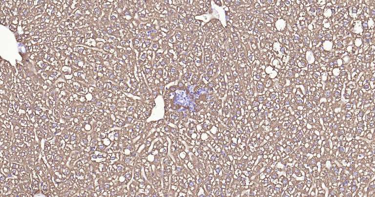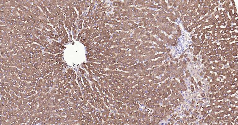 Immunohistochemical analysis of paraffin embedded mouse liver tissue slide using IHC0297 (ALDH1L1 IHC Kit).
