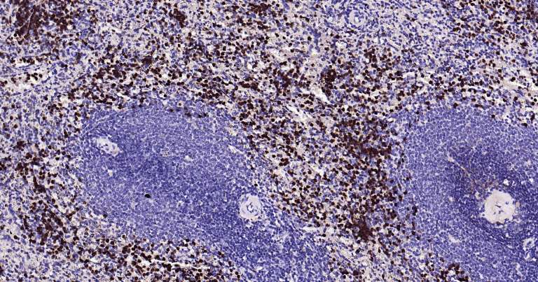 Immunohistochemical analysis of paraffin embedded human spleen tissue slide using IHC0298H (Human CD11b IHC Kit).