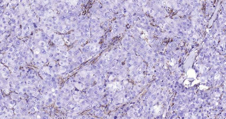 Immunohistochemical analysis of paraffin embedded human hepatocellular carcinoma tissue slide using IHC0301H (Human CD14 IHC Kit).