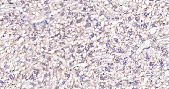 Paraformaldehyde-fixed, paraffin embedded Rat Liver; Antigen retrieval by boiling in sodium citrate buffer (pH6.0) for 15 min; Antibody incubation with TRAP1/HSP75 Monoclonal Antibody, Unconjugated(bsm-62998R) at 1:200 overnight at 4°C, followed by conjugation to the bs-0295G-HRP and DAB (C-0010) staining.