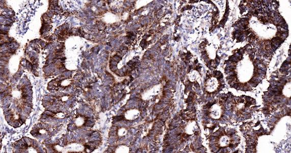 Paraformaldehyde-fixed, paraffin embedded Human Colon Cancer; Antigen retrieval by boiling in sodium citrate buffer (pH6.0) for 15 min; Antibody incubation with TRAP1/HSP75 Monoclonal Antibody, Unconjugated(bsm-62998R) at 1:200 overnight at 4°C, followed by conjugation to the bs-0295G-HRP and DAB (C-0010) staining.
