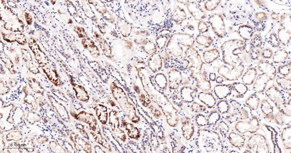 Paraformaldehyde-fixed, paraffin embedded Human Kidney; Antigen retrieval by boiling in sodium citrate buffer (pH6.0) for 15 min; Antibody incubation with TRAP1/HSP75 Monoclonal Antibody, Unconjugated(bsm-62998R) at 1:200 overnight at 4°C, followed by conjugation to the bs-0295G-HRP and DAB (C-0010) staining.