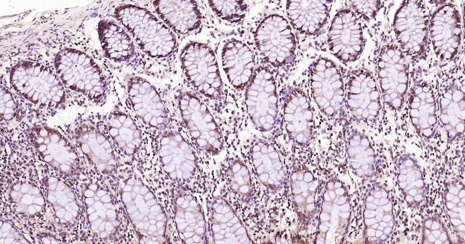 Paraformaldehyde-fixed, paraffin embedded Mouse Colon; Antigen retrieval by boiling in sodium citrate buffer (pH6.0) for 15 min; Antibody incubation with Ubiquitin Monoclonal Antibody, Unconjugated(bsm-63008R) at 1:200 overnight at 4°C, followed by conjugation to the bs-0295G-HRP and DAB (C-0010) staining and DAB (C-0010) staining.