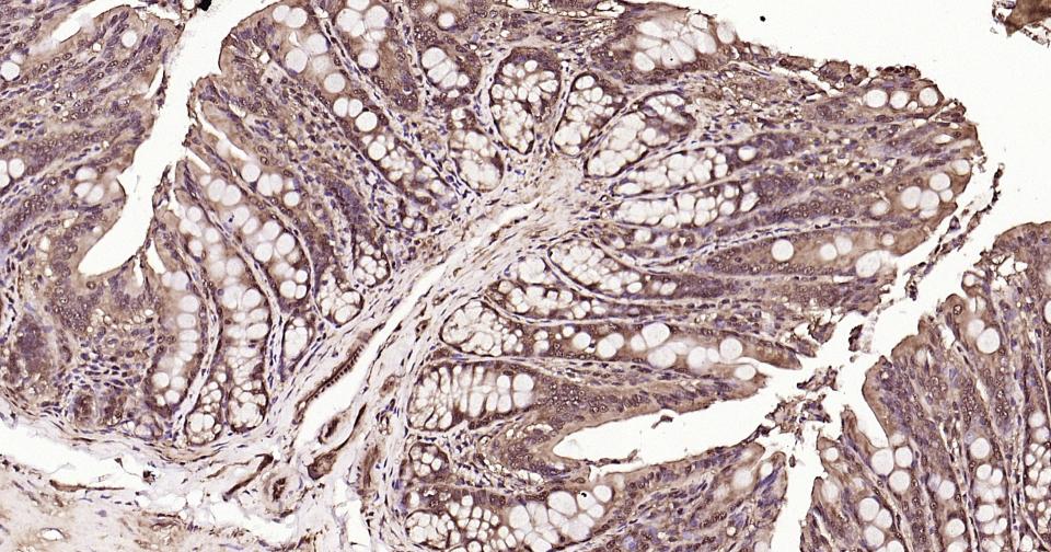 Paraformaldehyde-fixed, paraffin embedded Human Colon; Antigen retrieval by boiling in sodium citrate buffer (pH6.0) for 15 min; Antibody incubation with Ubiquitin Monoclonal Antibody, Unconjugated(bsm-63008R) at 1:200 overnight at 4°C, followed by conjugation to the bs-0295G-HRP and DAB (C-0010) staining and DAB (C-0010) staining.