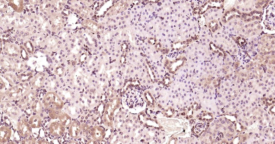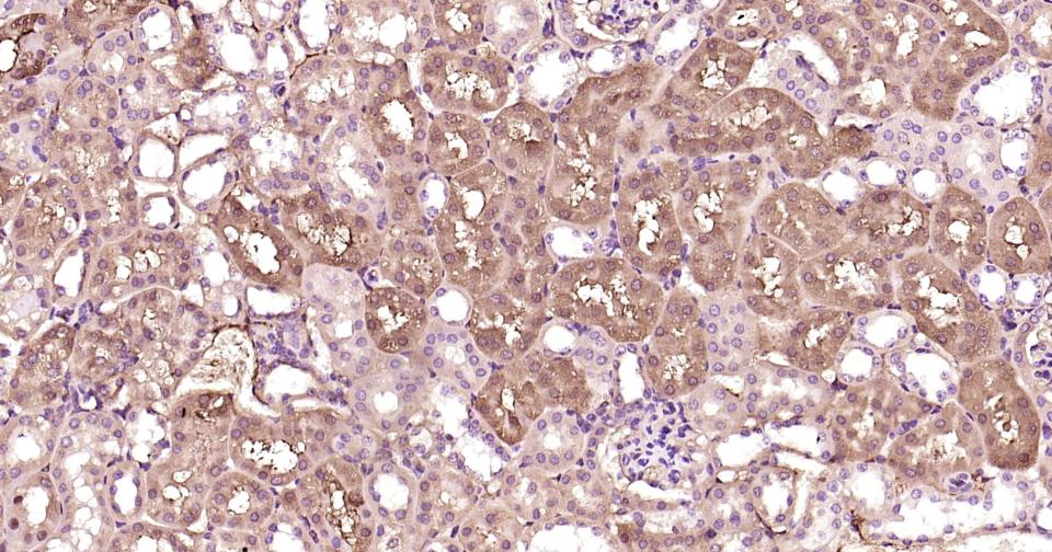Paraformaldehyde-fixed, paraffin embedded Mouse Kidney; Antigen retrieval by boiling in sodium citrate buffer (pH6.0) for 15 min; Antibody incubation with Ubiquitin Monoclonal Antibody, Unconjugated(bsm-63008R) at 1:200 overnight at 4°C, followed by conjugation to the bs-0295G-HRP and DAB (C-0010) staining and DAB (C-0010) staining.