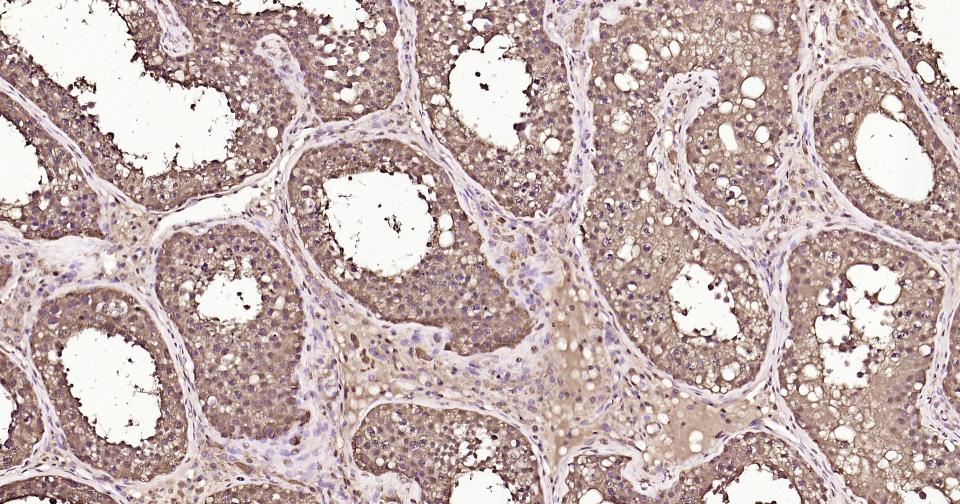 Paraformaldehyde-fixed, paraffin embedded Human Testicles; Antigen retrieval by boiling in sodium citrate buffer (pH6.0) for 15 min; Antibody incubation with Ubiquitin Monoclonal Antibody, Unconjugated(bsm-63008R) at 1:200 overnight at 4°C, followed by conjugation to the bs-0295G-HRP and DAB (C-0010) staining and DAB (C-0010) staining.