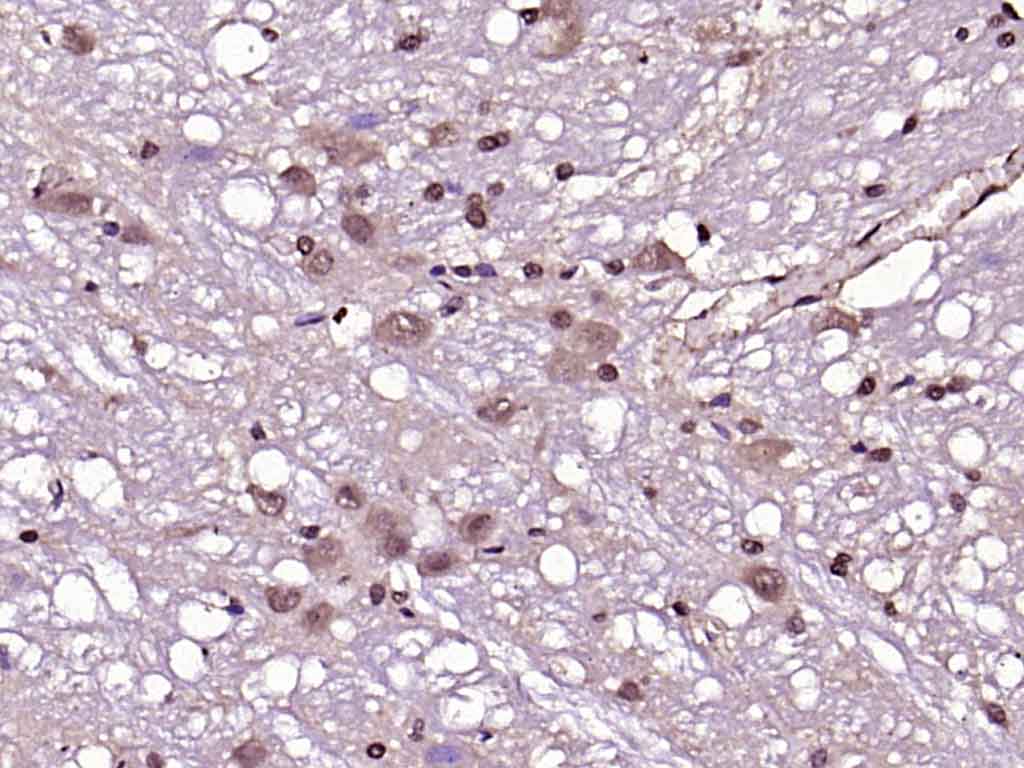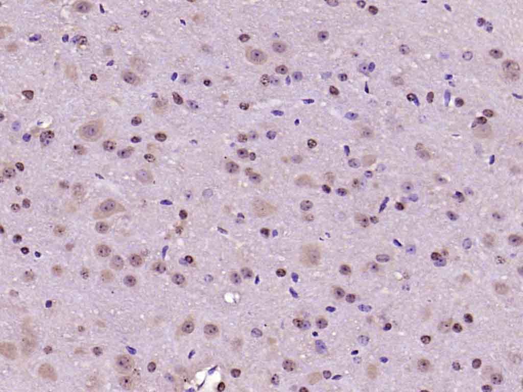 Paraformaldehyde-fixed, paraffin embedded (mouse brain); Antigen retrieval by boiling in sodium citrate buffer (pH6.0) for 15min; Block endogenous peroxidase by 3% hydrogen peroxide for 20 minutes; Blocking buffer (normal goat serum) at 37°C for 30min; Antibody incubation with (PAK5) Polyclonal Antibody, Unconjugated (bs-0655R ) at 1:200 overnight at 4°C, followed by operating according to SP Kit(Rabbit) (sp-0023) instructionsand DAB staining.