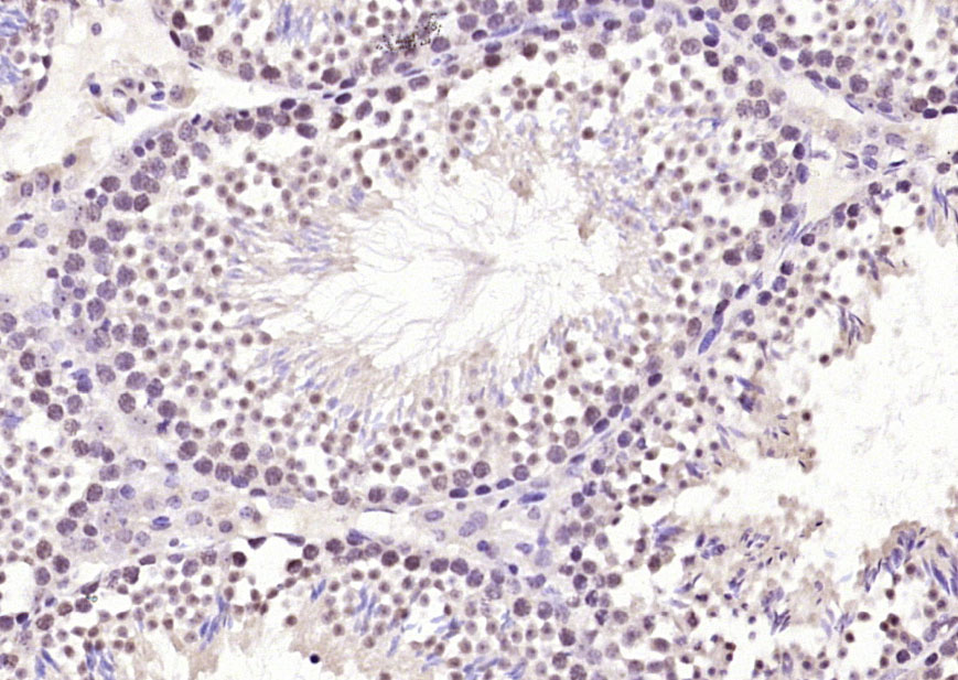 Paraformaldehyde-fixed, paraffin embedded (mouse testis); Antigen retrieval by boiling in sodium citrate buffer (pH6.0) for 15min; Block endogenous peroxidase by 3% hydrogen peroxide for 20 minutes; Blocking buffer (normal goat serum) at 37°C for 30min; Antibody incubation with (Ube2N) Polyclonal Antibody, Unconjugated (bs-8351R) at 1:200 overnight at 4°C, followed by operating according to SP Kit(Rabbit) (sp-0023) instructionsand DAB staining.